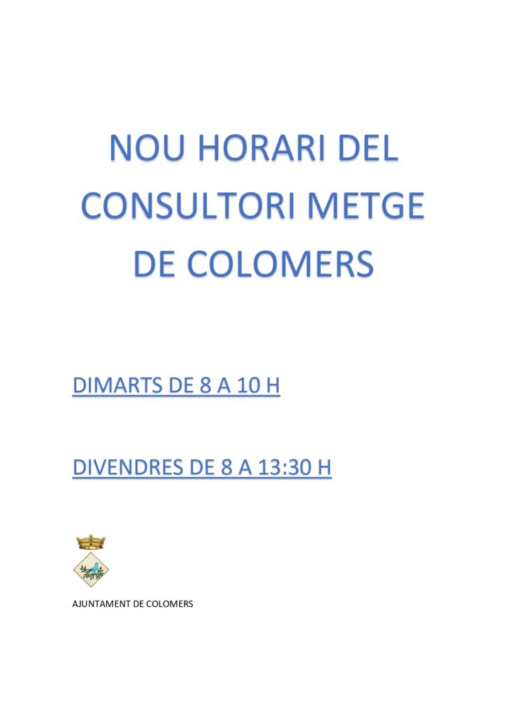 Horari consultori Nou horari del consultori mèdic de Colomers Dimarts de 8 h a 10 h Divendres de 8 h a 13.30 h